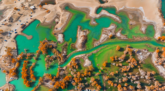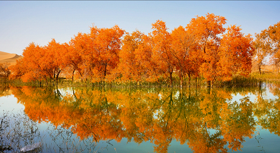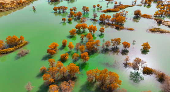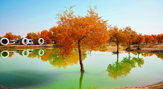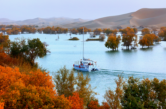ئالتۇن توغراق، بىپايان قۇم دېڭىزى، كۆللەر خۇددى ئەينەكتەك، شىنجاڭ ئىشلەپچىقىرىش-قۇرۇلۇش بىڭتۇەنى 2-شىدىكى خۇلۇداۋنىڭ كۈز پەسلى خۇددى ماي بوياق رەسىمدەك تەبىئەتنى رەڭگارەڭ تۈسكە كىرگۈزدى، كۆل ئوتتۇرىسىدىكى ساياھەت كېمىسى ئەينەك يۈزىنى يېرىپ، دولقۇنلار توغراقلارنىڭ سايىسىنى سۇندۇردى.
