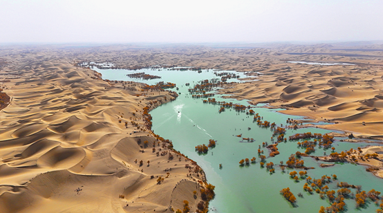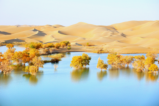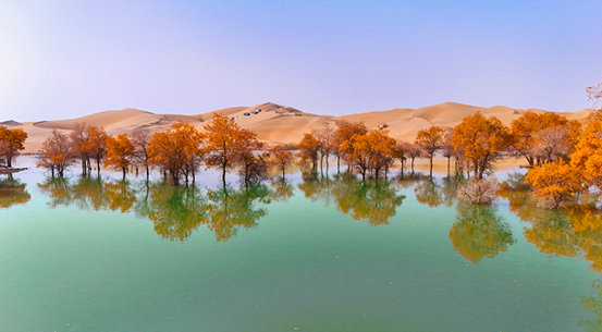ئالتۇن توغراقلار قۇم دېڭىزى بىلەن ئورالغان جايدا خالىغانچە «كۆيۈۋاتاتتى»، زۇمرەتتەك سۈزۈك سۇ خۇددى ئاسماندىن چۈشكەن ئەينەكتەك بۇلۇت ۋە قۇم بارخانلىرىنى قوينىغا ئالدى. تەن جيەنگۇڭ فوتوسى
