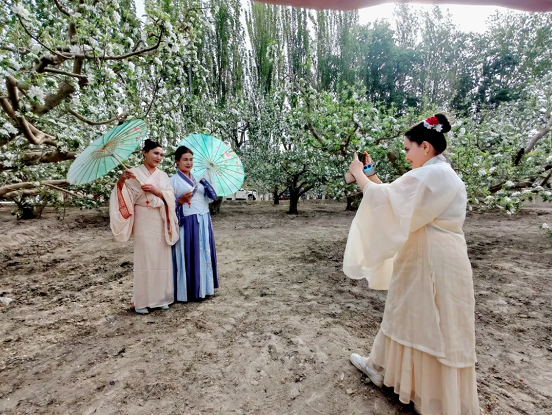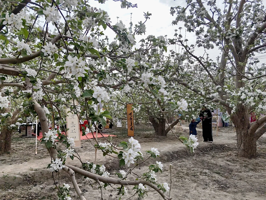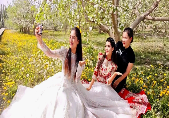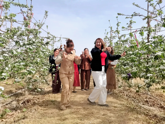 پوسكام ناھىيەسىدىكى خاس زامانىۋى خەلقنى بېيىتىش كەسىپلەر باغچىسىدا، تۇتاش كەتكەن مېۋىلىك دەرەخلەر چېچەك بىلەن قاپلانغان بولۇپ، گۈللەرنىڭ خۇش ھىدى ئەتراپقا تارىلىپ تۇراتتى. ئالما چېچىكى دېڭىزى بىلەن يېزا-قىشلاق، كەنتلەر بىر-بىرىگە ھۆسن قوشۇپ، ساياھەتچىلەرنى بۇ يەرگە كېلىپ سەيلە-ساياھەت قىلىپ، چېچەك سەيلىسى قىلىشقا، سۈرەتكە چۈشۈپ داكا قىلىپ، جەنۇبىي شىنجاڭنىڭ باھار كۈنلىرىدىكى گۈزەل سەھرا مەنزىرىسىنى چوڭقۇر چۆكۈش شەكلىدە ھېس قىلىشقا جەلپ قىلدى.