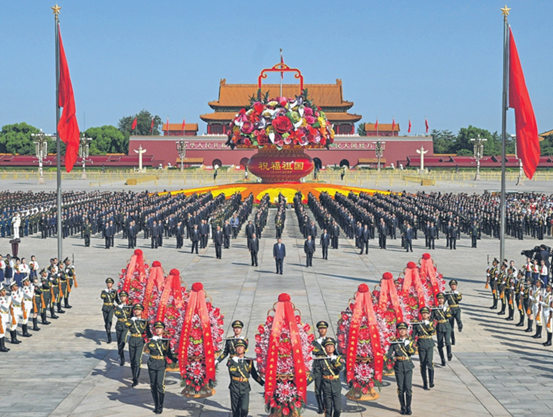 ھەيۋەتلىك تيەنئەنمېن مەيدانىدا، ئوتقاشتەك بەش يۇلتۇزلۇق قىزىل بايراق ئېگىز جەۋلان قىلىپ تۇراتتى، خەلق قەھرىمانلىرى خاتىرە مۇنارى ھەيۋەت بىلەن قەد كۆتۈرۈپ تۇراتتى. مەيدان مەركىزىدىكى «ۋەتەنگە بەخت تىلەيمىز» ناملىق غايەت زور گۈل سېۋىتى ۋەتەننىڭ گۈللەپ ياشنىشىغا بولغان گۈزەل تىلەكنى ئىپادىلەپ تۇراتتى. خاتىرە مۇنارىنىڭ شىمالىي تەرىپىدىكى ئىككى گۇرۇپپا گۈللۈكتە ئاق جۇخارگۈلى قاتارلىق گۈللەردىن ھاسىل قىلىنغان 18 گۈلچەمبىرەككە بارلىق جۇڭخۇا پەرزەنتلىرىنىڭ قەھرىمانلار - قۇربانلارغا بولغان چوڭقۇر سېغىنىشى مۇجەسسەملەنگەنىدى.