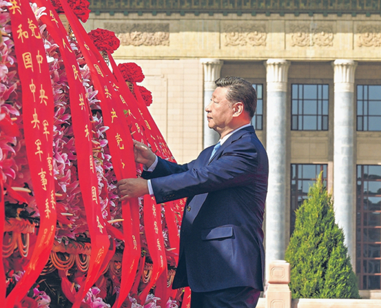 9 - ئاينىڭ 30 - كۈنى چۈشتىن بۇرۇن، پارتىيە ۋە دۆلەت رەھبەرلىرىدىن شى جىنپىڭ، لى چياڭ، جاۋ لېجى، ۋاڭ خۇنىڭ، سەي چى، دىڭ شۆشياڭ، لى شى، خەن جېڭ قاتارلىقلار بېيجىڭ تيەنئەنمېن مەيدانىغا كېلىپ، ئىنقىلابىي قۇربانلارنى خاتىرىلەش كۈنىدە خەلق قەھرىمانلىرىغا گۈل سېۋىتى تەقدىم قىلىش مۇراسىمىغا قاتناشتى. سۈرەتتە: شى جىنپىڭ گۈل سېۋىتىدىكى لېنتىلارنى رەتلىمەكتە. □شىنخۇا ئاگېنتلىقى مۇخبىرى لى شياڭ فوتوسى