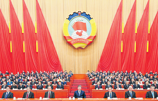 3 - ئاينىڭ 4 - كۈنى چۈشتىن كېيىن، جۇڭگو خەلق سىياسىي مەسلىھەت كېڭىشى 14 - نۆۋەتلىك مەملىكەتلىك كومىتېتى 4 - يىغىنى بېيجىڭ خەلق سارىيىدا ئېچىلدى. سۈرەتتە: شى جىنپىڭ، لى چياڭ، جاۋ لېجى، سەي چى، دىڭ شۆشياڭ، لى شى، خەن جېڭ رەئىس سەھنىسىدىن ئورۇن ئالدى. □ شىنخۇا ئاگېنتلىقى مۇخبىرى يەن يەن فوتوسى