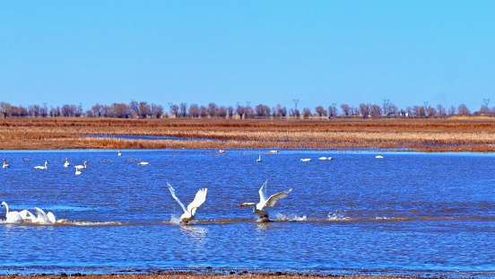سۈپسۈزۈك سۇ يۈزىدە، ئاق قۇلار قاناتلىرىنى كېرىپ، دولقۇن يېرىپ ئىلگىرىلىمەكتە.
